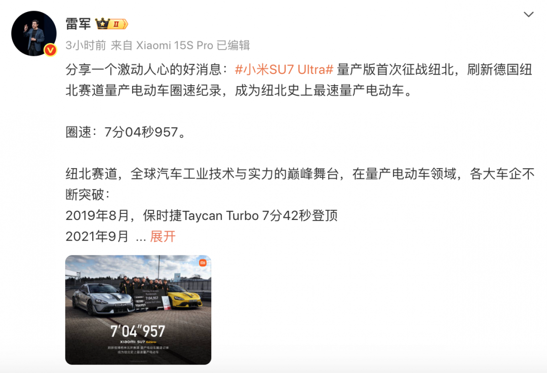 今天上昼,小米创办东说念主雷军在外交平台发文称,小米SU7 Ultra量产版初度开辟纽北,以7分04秒957刷新德国纽北赛说念量产电动车圈速记录,成为纽北史上最速量产电动车。