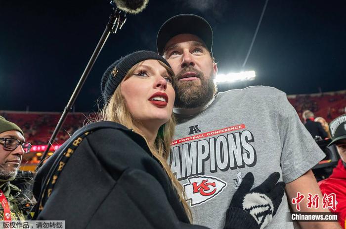贵府图:好意思国歌手泰勒·斯威夫特与橄榄球畅通员特拉维斯·凯尔西。